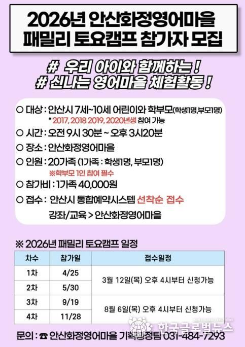 민진영 안산화정영어마을 원장(안산대학교 교양학부 교수)은 “패밀리 토요캠프는 가족이 함께 배우고 성장하는 경험에 의미를 두고 기획했다”며 “아이들이 말하기 중심 체험을 통해 영어 자신감을 키우고, 가정과 지역사회가 연계된 학습 환경 속에서 지속적으로 영어를 접할 수 있는 기반이 되길 바란다”고 말했다.