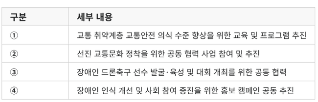 이어 한국선진교통문화연합회의 교통안전 활동과 장애인 스포츠를 연계함으로써 장애인의 교통 안전 의식 강화와 사회 참여 확대라는 두 가지 목표를 동시에 실현할 수 있을 것으로 기대했다.