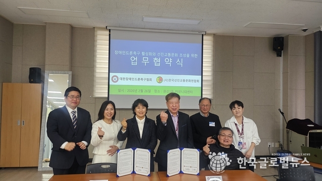 (한국글로벌뉴스 -박소연 기자) 대한장애인드론축구협회(KPDSA)와, (사)한국선진교통문화연합회가 2월 26일(목) 공식 업무협약(MOU) 체결식을 가졌다. 이번 협약은 두 기관이 상호 신뢰와 협력을 바탕으로 교통안전 의식 제고, 선진 교통문화 정착, 장애인 인식 개선 및 드론축구 저변 확대라는 공동 목표를 향해 함께 나아가기 위해 마련됐다.