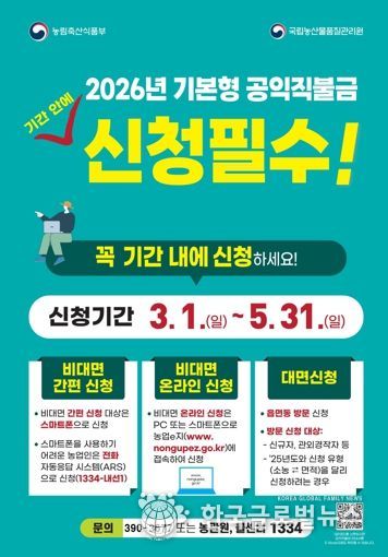 (한국글로벌뉴스 - 박소연 기자) 군포시는 3월 1일부터 5월 31일까지 ‘2026년 기본형 공익직불금’ 신청을 접수한다고 밝혔다.