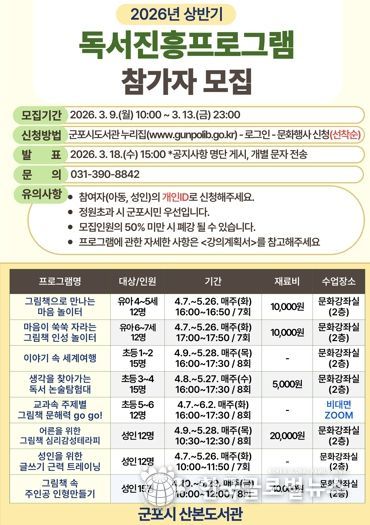 (한국글로벌뉴스 - 박소연 기자) 군포시 산본도서관이 2026년 상반기 유아부터 성인까지 참여할 수 있는 독서진흥프로그램을 운영하고, 이에 앞서 참가자를 모집한다.