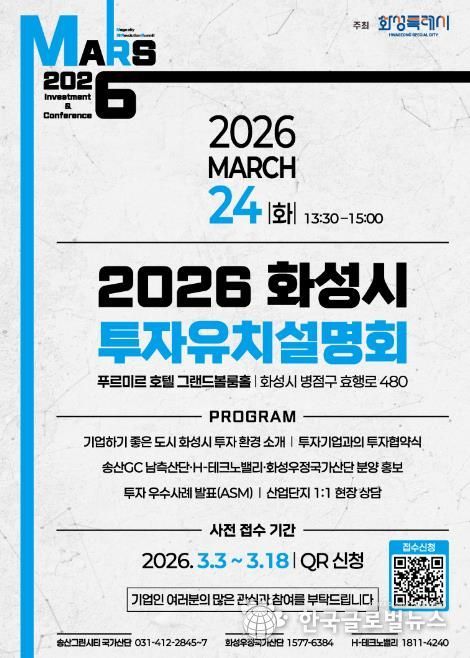 (한국글로벌뉴스 - 박소연 기자) 화성특례시가 오는 3월 24일 푸르미르 호텔에서 ‘2026 화성특례시 투자유치 설명회’를 개최하고, 3월 3일부터 3월 18일까지 QR코드를 통한 사전접수를 진행한다.