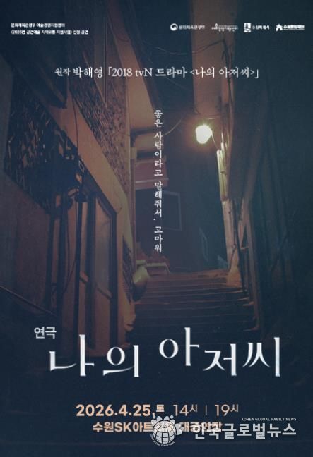 (한국글로벌뉴스 - 박소연 기자) 수원문화재단 수원SK아트리움은 오는 4월 25일, 수많은 시청자의 인생 드라마로 손꼽히는 tvN 드라마 원작의 연극 ‘나의 아저씨’를 대공연장 무대에 올린다고 밝혔다.