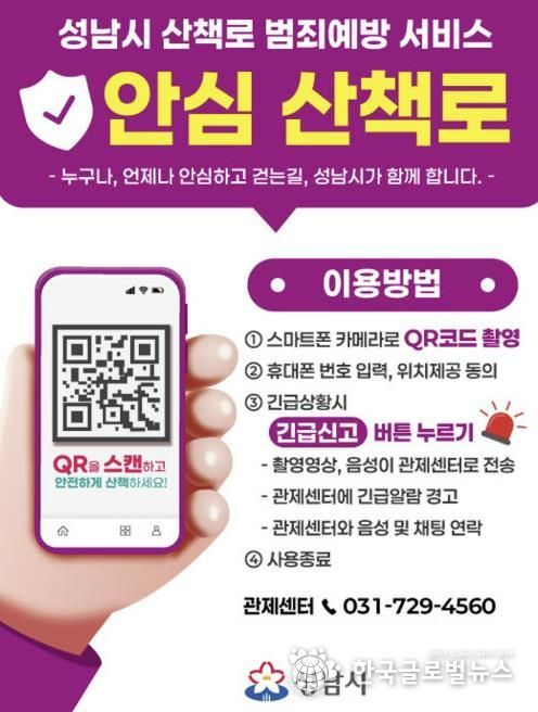 (한국글로벌뉴스 - 박소연 기자) 성남시는 시민들이 보다 안심하고 산책로를 이용할 수 있도록 영장산과 불곡산 일대 산책로에 ‘범죄예방 서비스’를 6일부터 도입한다.