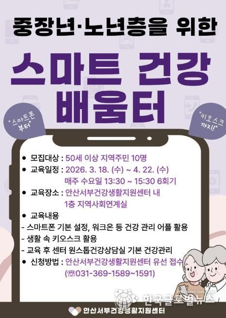 (한국글로벌뉴스 - 박소연 기자) 안산시는 단원보건소 서부건강생활지원센터는 오는 18일부터 ‘중장년‧노년층을 위한 스마트 건강 배움터’를 운영한다고 6일 밝혔다.