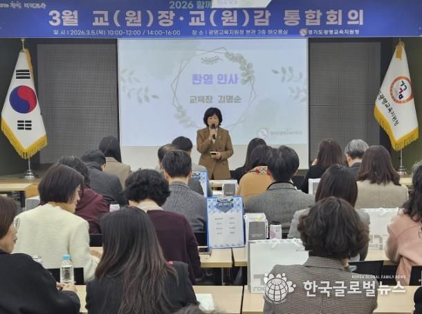 (한국글로벌뉴스 - 박소연 기자) 경기도광명교육지원청은 3월 5일, 광명교육지원청 3층 해오름실에서 2026 해오름 광명교육과 경기미래교육 구현을 위한 ‘2026년 3월 교(원)장, 교(원)감 통합회의’를 운영했다. 이번 통합회의는 학년 초 학교와 교육지원청, 도교육청 간의 협력을 강화하고, 학교 중심의 교육정책, 미래장학, 교육과정운영의 선순환 체제를 통해 학교 중심 행정 지원의 기틀을 마련하고자 진행됐다.
