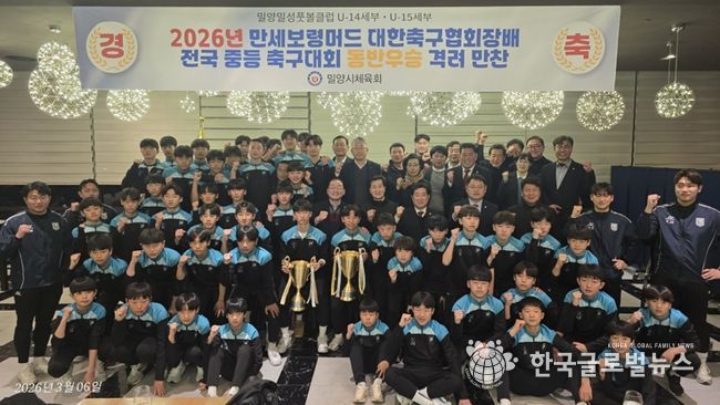 (한국글로벌뉴스 - 박지형 기자) 밀양시체육회는 지난 6일 밀양아리나호텔에서 ‘2026 만세보령머드 대한축구협회장배 전국 중등 축구대회’에서 동반 우승을 차지한 밀양·밀성풋볼 스포츠클럽(U-15, U-14) 선수단을 격려하기 위한 축하 만찬을 개최했다고 밝혔다.