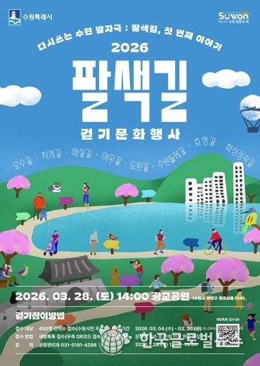 (한국글로벌뉴스 - 박소연 기자) 수원특례시가 ‘2026 팔색길 걷기 문화행사’에 참여할 시민 400명을 3월 20일까지 선착순으로 모집한다.