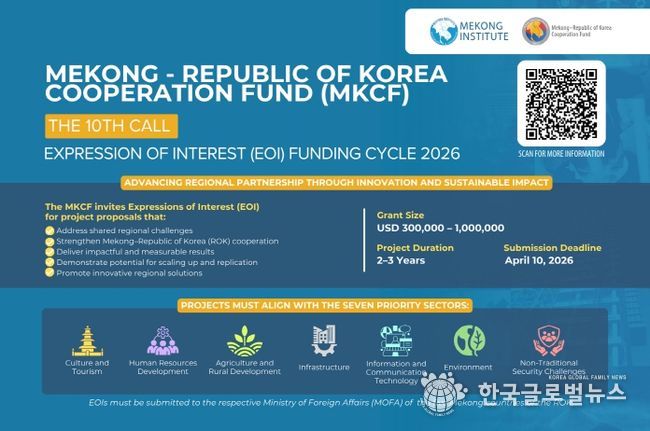 (한국글로벌뉴스 - 아셀 기자) 외교부는 3월 6일부터 4월 10일까지 제10차 한-메콩 협력기금(MKCF, Mekong-Korea Cooperation Fund) 사업 선정 공모를 진행한다.