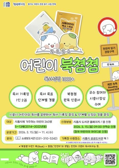 (한국글로벌뉴스 - 박소연 기자) 시흥시 소래빛도서관은 오는 3월 15일부터 관내 5~13세 어린이 260명을 대상으로 독서 기록장을 배부하고, 우수 참여자 8명에게 시흥시장상을 수여하는 독서사업 ‘2026 어린이 북쳠쳠 독서성장 1000+’를 운영한다.