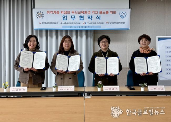 9일 경기도교육청평생학습관에서 열린 협약식에는 류영신 평생학습관장과 시흥·안산·안성지역아동센터협의(연합)회 회장 등 주요 관계자들이 참석해 취약계층 학생들의 독서 기반 교육환경을 개선하고 지역 간 교육 격차를 해소하는 데 힘을 모으기로 약속했다.