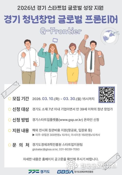 (한국글로벌뉴스 - 박소연 기자) 경기도와 경기도경제과학진흥원은 도내 청년 창업가들의 글로벌 시장 진출의 시작을 돕는 ‘경기 청년창업 글로벌 프론티어(G-Frontier)’ 참여기업 20개사를 오는 30일까지 모집한다.