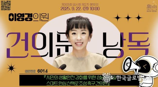 (한국글로벌뉴스 - 박소연 기자) 성남시의회 이영경 의원(서현1, 2동)은 성남시가 영장산과 불곡산 일대 산책로에 QR코드를 활용한 범죄예방 신고 서비스를 도입한 것과 관련해 “시민 안전을 위한 의미 있는 조치”라며 성남시 집행부에 감사의 뜻을 전했다.
