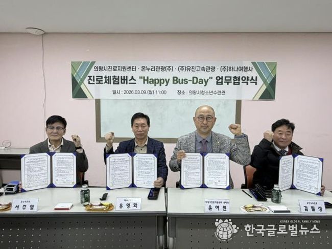 (한국글로벌뉴스 - 박소연 기자) 의왕시청소년재단 산하 의왕시진로지원센터 ‘꿈터’가 청소년들의 진로 탐색을 지원하기 위해 3월 9일 관내 운수업체와 ‘진로체험버스’ 운영을 위한 업무협약(MOU)을 체결했다.