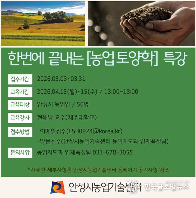 (한국글로벌뉴스 - 박소연 기자) 안성시농업기술센터가 오는 31일까지 토양 분야 권위자인 제주대학교 현해남 교수를 초청해 ‘농업 토양학 특강’ 교육생을 모집한다.