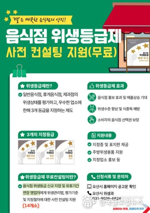 (한국글로벌뉴스 - 박소연 기자) 오산시는 관내 음식점의 위생 수준 향상과 안전한 외식환경 조성을 위해 ‘음식점 위생등급제(식품안심업소) 사전 컨설팅’ 참여 업소를 모집한다고 10일 밝혔다.
