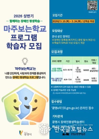 (한국글로벌뉴스 - 박소연 기자) 광명시 평생학습원은 장애인 학습자의 자기 이해와 사회 참여 역량 강화를 위한 평생학습 프로그램 ‘마주보는학교’의 상반기 수강생을 오는 24일까지 모집한다.