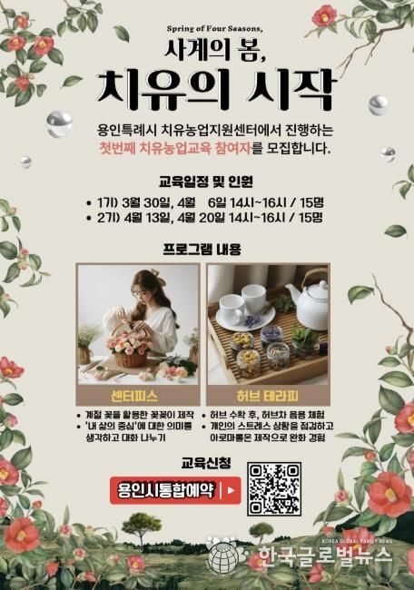(한국글로벌뉴스 - 박소연 기자) 용인시 농업기술센터는 치유농업지원센터에서 오는 3월 20일부터 4월 20일까지 치유농업 프로그램 ‘사계의 봄(Spring of Four Seasons), 치유의 시작’을 운영한다고 11일 밝혔다.