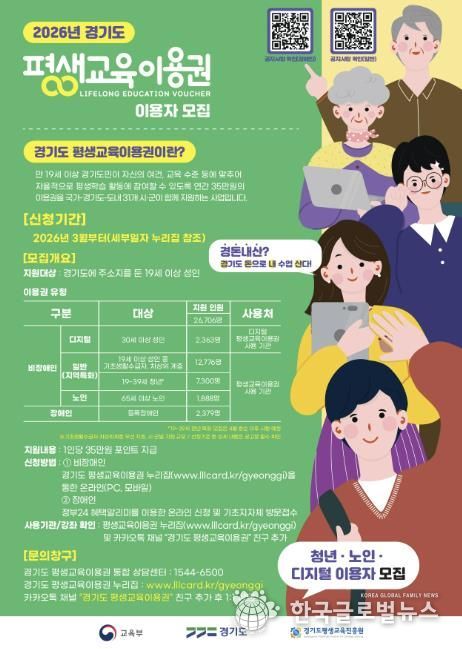 (한국글로벌뉴스 - 박소연 기자) 안산시는 경기도와 함께 이달 31일까지 ‘2026년 제1차 경기도 평생교육이용권’ 지원사업 신청자를 모집한다고 11일 밝혔다.