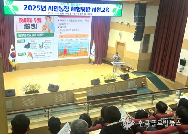 (한국글로벌뉴스 - 박소연 기자) 수원특례시는 3월 12일부터 14일까지 수원시청 별관 2층 대강당에서 시민농장 체험텃밭 참여자 1900세대를 대상으로 6회에 걸쳐 ‘2026년 새빛 시민농장 체험텃밭 사전교육’을 한다.