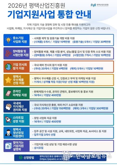 (한국글로벌뉴스 - 박소연 기자) 평택시와 평택산업진흥원은 관내 중소기업의 성장 기반 마련과 시장 경쟁력 강화를 위해 녪년 기업지원사업’을 본격 추진하고 참여기업 모집에 나섰다.
