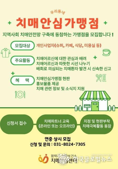 (한국글로벌뉴스 - 박소연 기자) 평택시 송탄치매안심센터는 지역사회 내 치매 친화적 환경 조성과 촘촘한 치매 안전망 구축을 위해 ‘치매안심가맹점’을 신규 모집한다고 밝혔다.