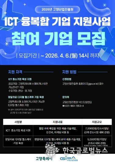(한국글로벌뉴스 - 박종욱 기자) 고양산업진흥원이 ‘2026 고양 ICT 융복합 지원사업’ 참여 기업을 모집한다.