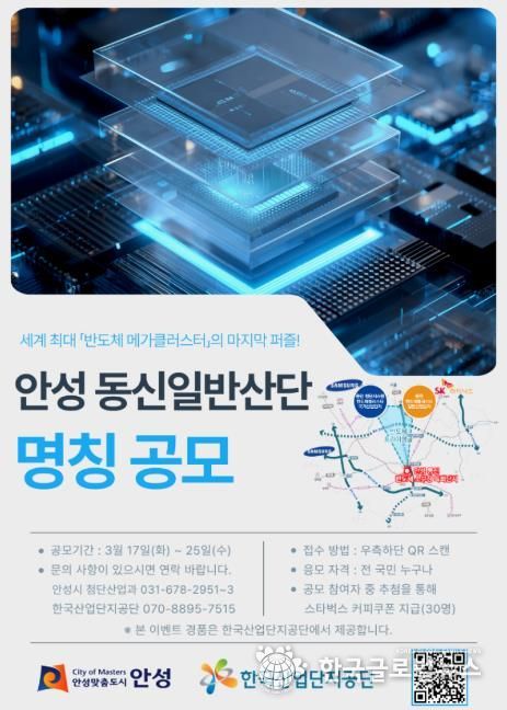 (한국글로벌뉴스 - 박소연 기자) 안성시와 한국산업단지공단이 안성 동신일반산업단지의 새로운 명칭을 찾기 위해 전 국민 대상 아이디어 공모전을 개최한다. 이번 공모는 반도체 소부장 특화단지로서의 정체성을 확립하고 미래지향적인 브랜딩을 구축하기 위해 마련됐다.