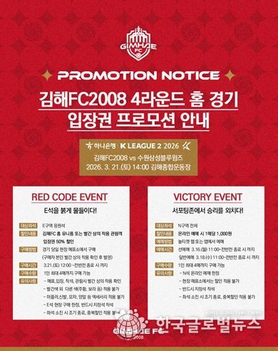 (한국글로벌뉴스 - 박지형 기자) 김해FC2008이 오는 21일 오후 2시 김해종합운동장에서 열리는 수원삼성블루윙즈와의 ‘하나은행 K리그2 2026’ 4라운드 홈 경기를 앞두고, 첫 승을 기원하는 대대적인 할인 프로모션을 진행한다고 밝혔다.