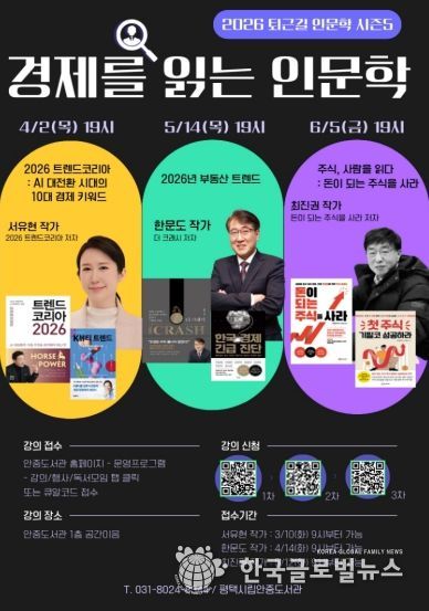 이번 강연은 ‘경제를 읽는 인문학’을 주제로 총 3회에 걸쳐 진행되며, 각 분야 전문가를 초청해 2026년 트렌드, 부동산, 주식 등 시민들의 실생활과 밀접한 경제 이슈를 인문학적 관점에서 풀어낼 예정이다.