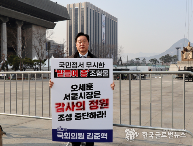 (한국글로벌뉴스 -박소연 기자) 더불어민주당 김준혁 국회의원이 오세훈 서울시장의 광화문 ‘감사의 정원’ 조성 사업 강행을 비판하며 기자회견과 1인 시위를 진행했다.