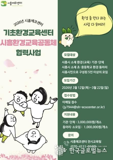 (한국글로벌뉴스 - 박소연 기자) 시흥시는 지역 공동체 간 협력을 바탕으로 환경교육을 활성화하고, 환경교육 네트워크를 강화하기 위해 ‘2026년 기초환경교육센터-시흥환경교육공동체 협력사업’을 추진한다.