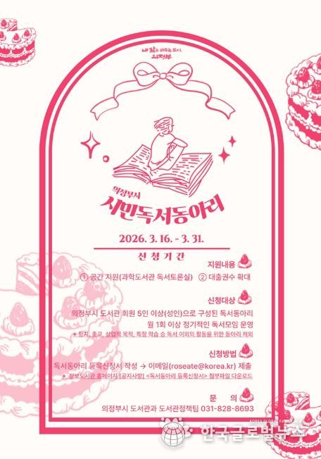 (한국글로벌뉴스 - 박소연 기자) 의정부시는 독서공동체의 자발적 참여를 촉진하고 독서 문화의 기반을 마련하기 위해 ‘2026년 시민 독서동아리’를 운영한다.