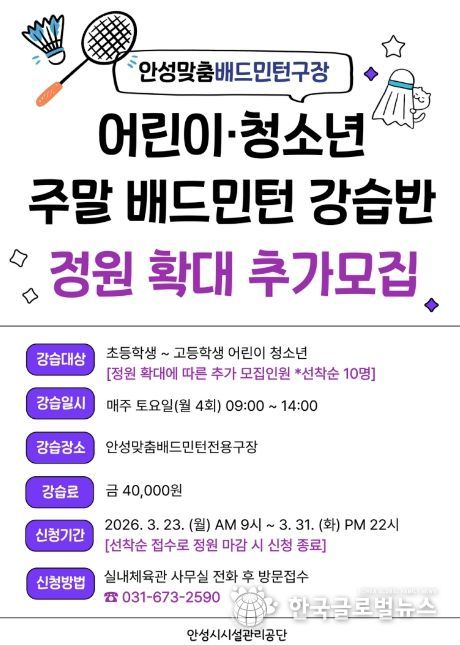 (한국글로벌뉴스 - 박소연 기자) 안성시시설관리공단은 안성 시민 생활체육 활성화를 위해 현재 운영 중인 주말 어린이・청소년 배드민턴 강습반 정원을 확대하고 추가 수강생을 모집한다고 밝혔다.