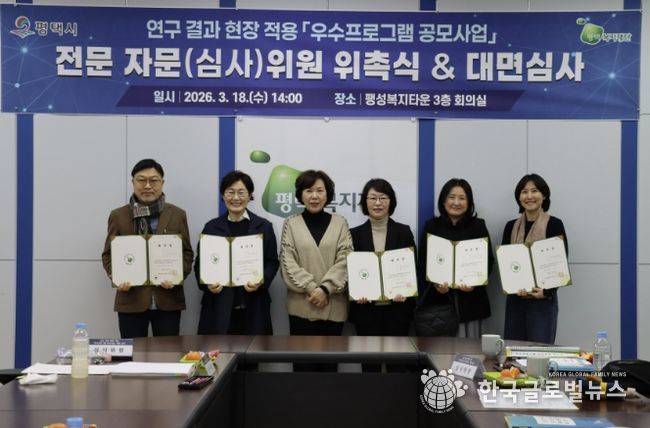 (한국글로벌뉴스 - 박소연 기자) 평택복지재단은 2026년 3월 18일, 팽성복지타운에서 관내 사회복지 서비스의 질적 도약과 지역복지 강화를 위한녪년 연구 결과 현장 적용 우수프로그램 공모사업’심사위원 위촉식 및 대면 심사를 진행했다.