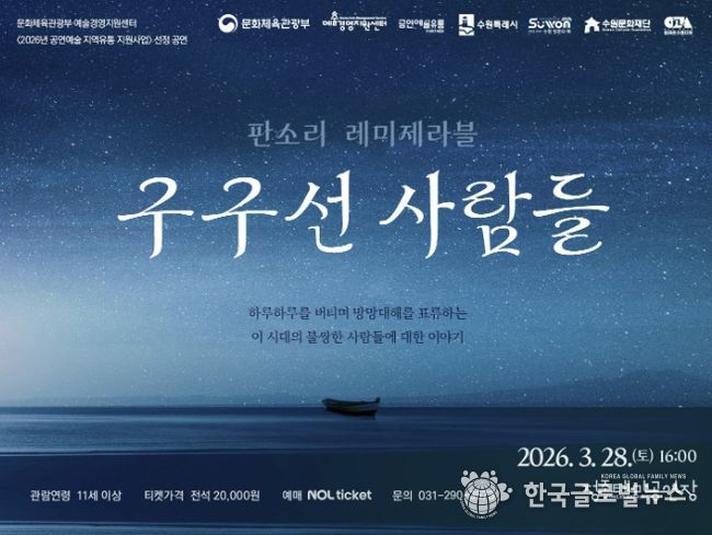 수원문화재단은 정조테마공연장에서 오는 28일 오후 4시, 문화체육관광부와 예술경영지원센터의 ‘2026 공연예술 지역유통 지원사업’ 선정작인 ‘판소리 레미제라블 '구구선 사람들'’을 선보인다.