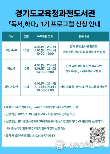 (한국글로벌뉴스 - 박소연 기자) 경기도교육청과천도서관이 지역주민의 독서 역량 강화와 융합적 사고력 함양을 위해 '2026년 독서, 하다’프로그램을 운영한다.