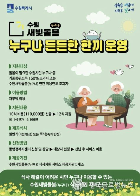 수원시 관계자는 “누구나 든든한 한끼는 기존 지원 기준을 넘어선 시민들도 돌봄서비스를 이어갈 수 있도록 보완한 사업”이라며 “시민의 건강한 식생활과 건강 증진에 도움이 되길 바란다”고 말했다.