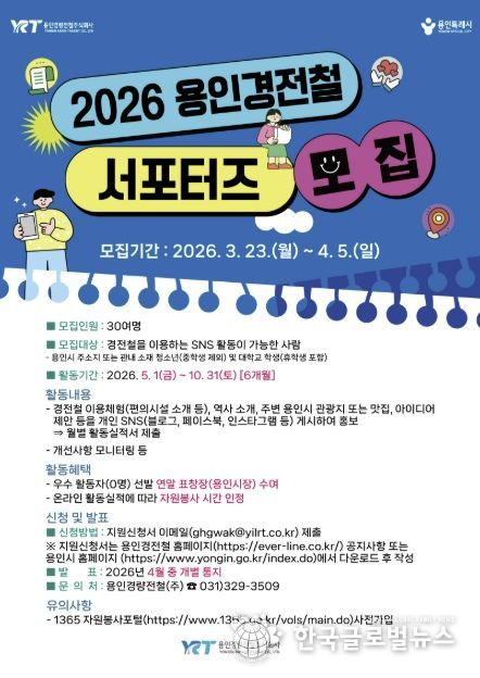 (한국글로벌뉴스 - 박소연 기자) 용인특례시는 4월 5일까지 용인의 대표적인 철도인 용인경전철을 활성화하고자 ‘용인경전철 서포터즈’를 모집한다고 23일 밝혔다.