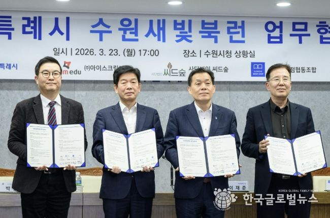 수원시와 ㈜아이스크림에듀, (사)씨드(Seed)숲, 수원시서점협동조합은 23일 시청 상황실에서 ‘수원새빛북런(Book Learn) 업무협약’을 체결하고, 협력을 약속했다.
