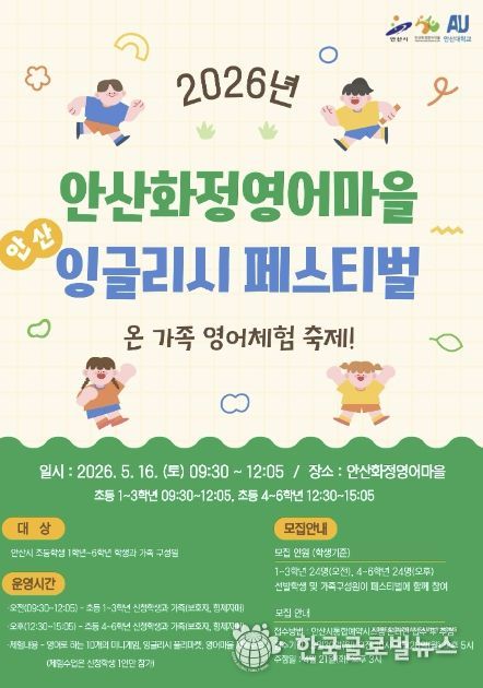 (한국글로벌뉴스 - 박소연 기자) 안산시가 설립하고 안산대학교가 운영하는 안산화정영어마을은 ‘온 가족 영어체험 축제!’를 주제로 ‘안산 잉글리시 페스티벌’을 운영한다고 24일 밝혔다.