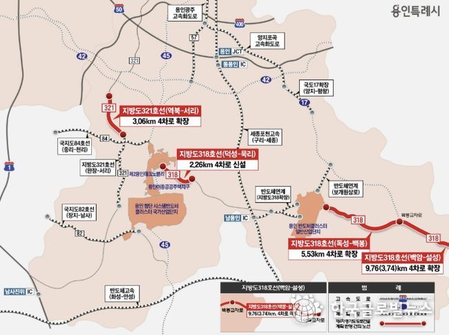 시는 이 사업을 남사읍 완장리에서 이동읍 서리를 잇는 지방도 321호선 4.61㎞ 구간 확장 사업과 연계해서 추진할 계획이다. 사업에는 약 534억 원이 투입된다.