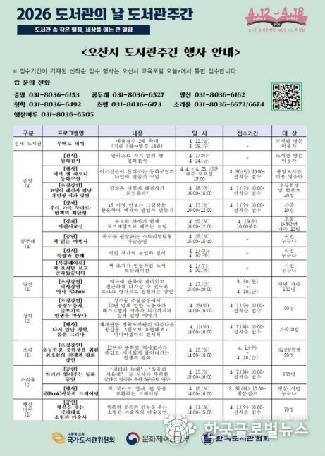(한국글로벌뉴스 - 박소연 기자) 오산시는 2026년 도서관의 날(4월 12일)과 도서관주간(4월 12일~4월 18일)을 맞아 시민 누구나 참여할 수 있는 다양한 독서문화 행사를 운영한다고 밝혔다.
