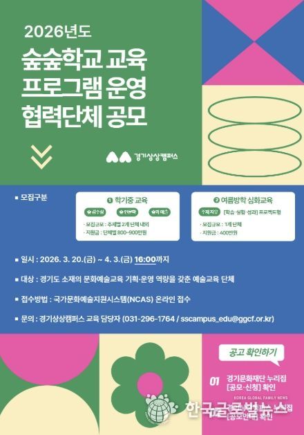 (한국글로벌뉴스 - 박소연 기자) 경기문화재단 경기상상캠퍼스는 3월 20일부터 4월 3일 16시까지 2026 경기상상캠퍼스 ‘숲숲학교’ 교육 협력단체를 공개 모집한다.