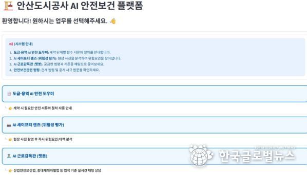 (한국글로벌뉴스 - 박소연 기자) 안산도시공사는 생성형 인공지능(AI) 기술을 접목한 ‘AI 안전보건 플랫폼’을 자체 개발해 현장 사고 예방 업무에 본격적으로 활용한다고 25일 밝혔다.