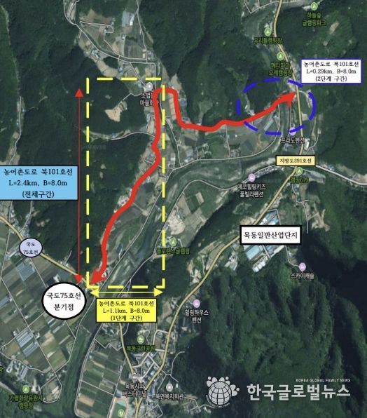 북101호선은 북면 제령리 목동교회 인근에서 소법리 골말교 인근까지 이어지는 총 2.4km 구간이다. 1단계 사업은 2023년 12월 준공과 함께 도로를 개통했으며, 군은 2024년부터 2단계 구간 노선 지정을 위한 행정절차를 진행해 왔다. 이어 올해 1월 보상 협의를 완료하면서 4월 공사 착공을 앞두게 됐다.