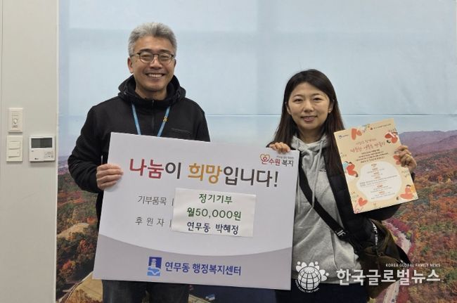 (한국글로벌뉴스 - 박소연 기자) 수원시 장안구 연무동은 지난 23일, 관내에 15년째 거주하고 있는 외국인 가족이 어려운 이웃을 위해 써달라며 매월 정기후원을 약정했다는 훈훈한 소식을 전했다.