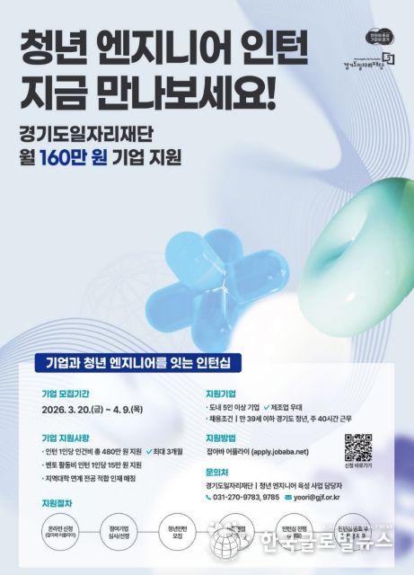 (한국글로벌뉴스 - 박소연 기자) 경기도일자리재단이 ‘청년 엔지니어 육성사업 : 지역 청년 채용연계형 인턴십’ 참여기업을 4월 9일까지 모집한다. 도내 기업과 청년을 연계해 실무 중심 인턴십을 지원하는 사업이다. 최근 ‘경력직 같은 신입’을 선호하는 채용 흐름에 대응해 현장 중심 인재 양성과 기업의 채용 수요 연계를 위해 추진한다.