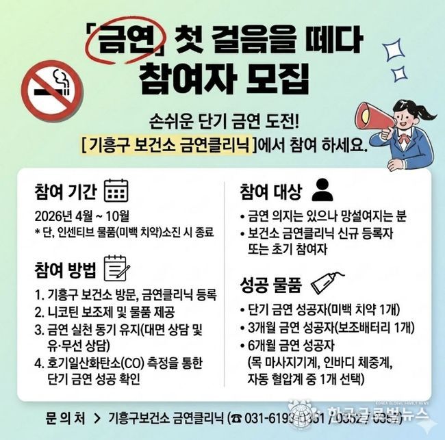 (한국글로벌뉴스 - 박소연 기자) 용인특례시 기흥구보건소는 4월부터 10월까지 금연을 희망하는 흡연자를 대상으로 ‘단기 금연 프로그램’을 시범 운영한다고 30일 밝혔다.