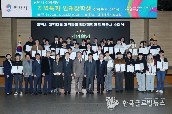 (한국글로벌뉴스 - 박소연 기자) 평택시 장학재단은 지난 3월 28일 평택시청 대회의실에서 '2026년도 지역특화 인재 장학생 장학증서 수여식'을 개최했다.